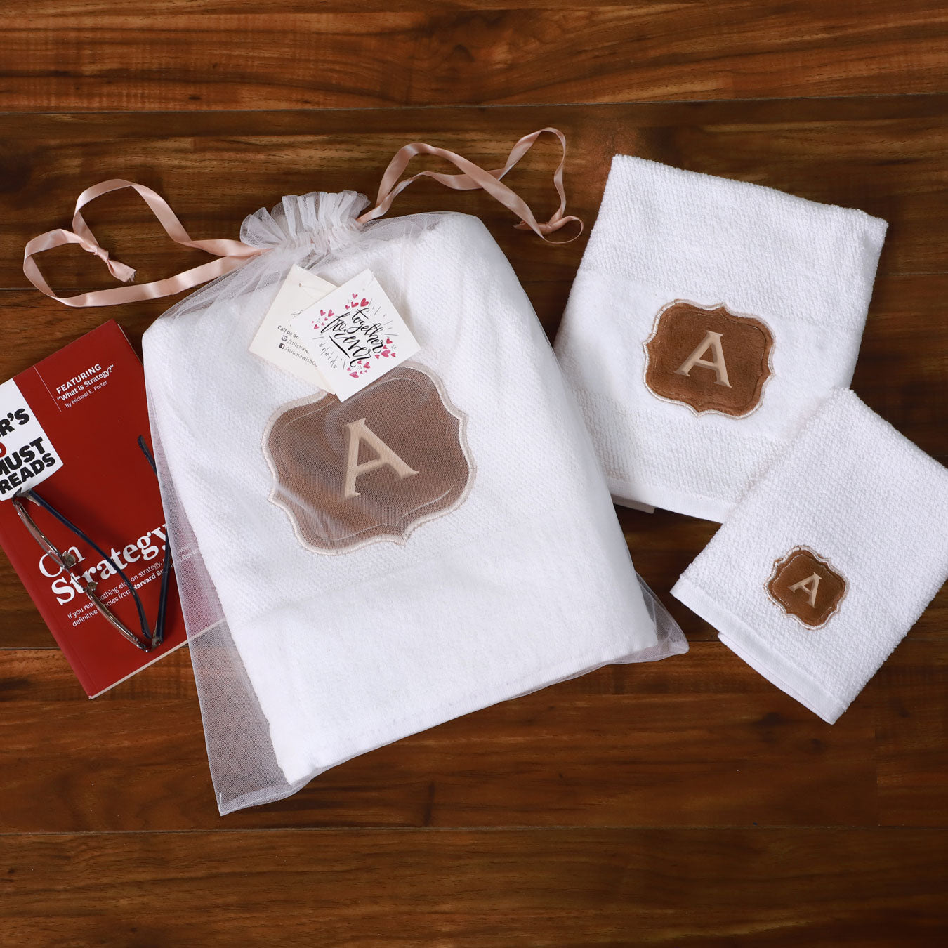 This monogrammed towel set is truly a classic design! Elegant and chic, this makes for a great luxury gift set! Consists of one bath, one hand and one face towel.